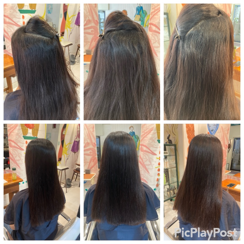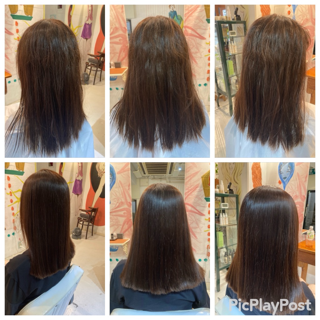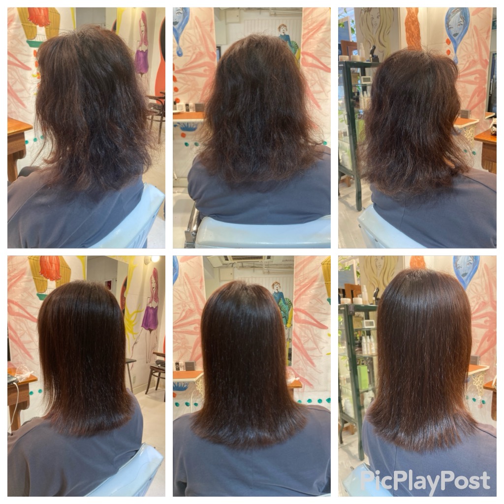 日本一優れた縮毛矯正薬剤をメインに使用した縮毛矯正の技術であり、髪を回復させる魔法の技術、薬剤を使用しているわけではありません。むしろ全国どこを探しても髪を回復させる技術、薬剤、商材は絶対に存在しません。お客様のダメージレベルによっては、一発で、もしくは段階的にキレイにできますが、傷んだ髪は絶対に回復しません。その事をしっかりご理解したうえでの御来店をお願いします。