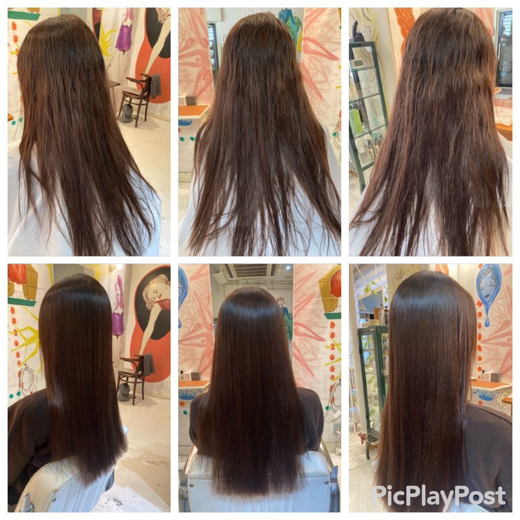 日本一優れた縮毛矯正薬剤をメインに使用した縮毛矯正の技術であり、髪を回復させる魔法の技術、薬剤を使用しているわけではありません。むしろ全国どこを探しても髪を回復させる技術、薬剤、商材は絶対に存在しません。お客様のダメージレベルによっては、一発で、もしくは段階的にキレイにできますが、傷んだ髪は絶対に回復しません。その事をしっかりご理解したうえでの御来店をお願いします。